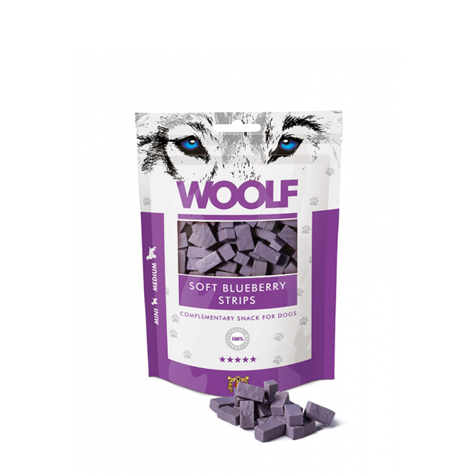 Strisce di mirtillo e pollo, monoproteico. Gli snack Woolf sono appositamente studiati per cani di tutte le taglie.